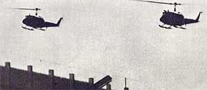 – ore 16,20 – GIS, CC, AdC attaccano simultaneamente dall’alto (elicotteri) e dal basso, fregandosene della vita degli ostaggi. Il primo attacco alla rotonda del piano terra viene respinto dal lancio di una molotov e di una bomba al plastico. I mercenari attaccanti volano per aria. Apprendiamo in seguito che più di 20 resteranno feriti. A questo punto, davanti al cancello della rampa che immette sulla rotonda, vengono portati da noi due ostaggi, allo scopo di ricordare al nemico che non avremmo permesso un massacro senza adeguata rappresaglia. Nel frattempo i GIS sono calati sul tetto del carcere dagli elicotteri, mentre un elicottero copriva l’operazione sparando sui finestroni della rotonda del primo e secondo piano, in modo da impedire il presidio da parte dei proletari prig. armati di bombe. Nelle rampe delle scale, inoltre, vengono fatte esplodere una serie di saponette di esplosivo davanti ai finestroni, di cui una davanti alla finestra della stanza del telefono dove la Direzione pensava fossero riuniti i responsabili del C.d.L.