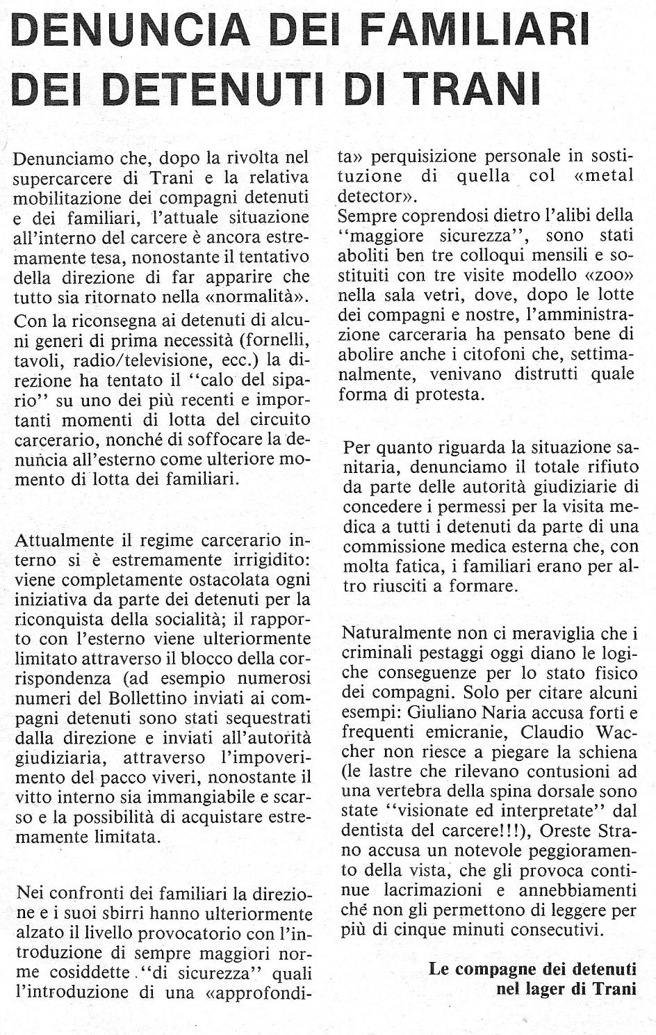 Questa voce è stata pubblicata in Rivolta di Trani e contrassegnata con carceri, carceri speciali, detenuti politici, lotta armata, rivolte in carcere, Trani. Contrassegna il permalink.