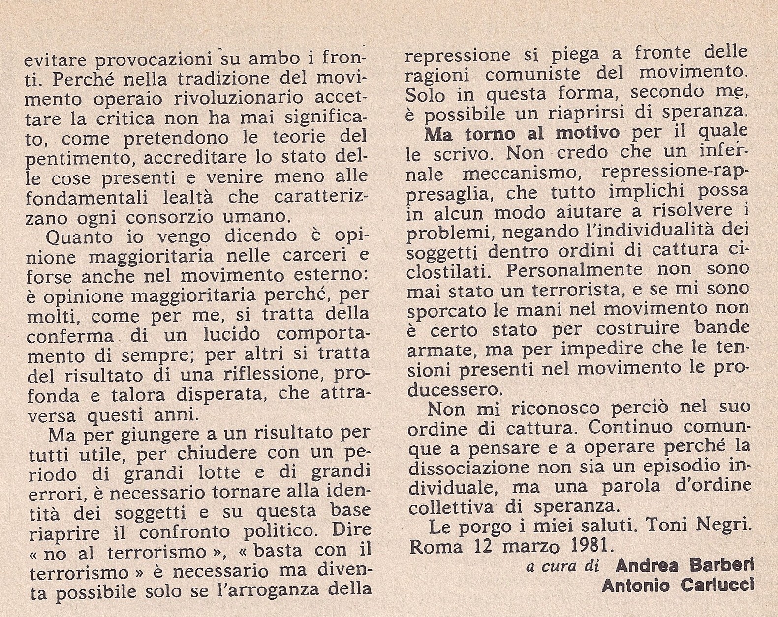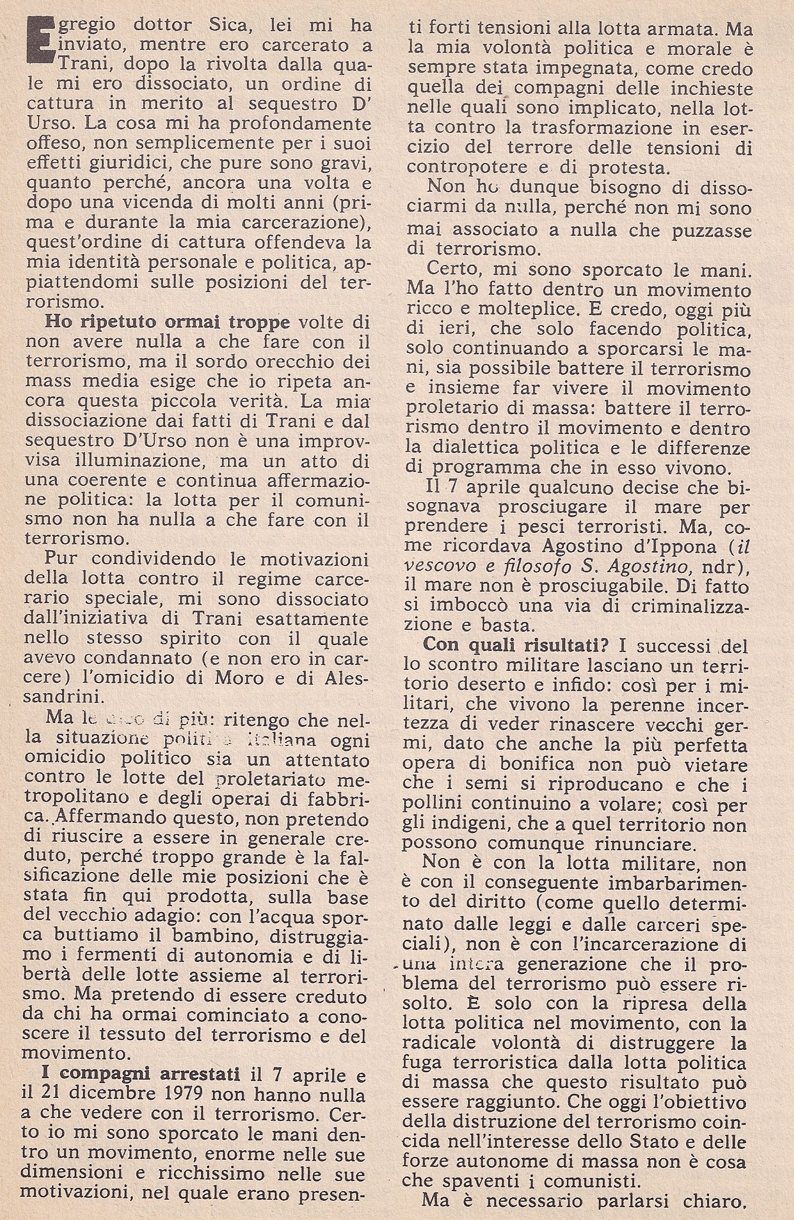 Questa voce è stata pubblicata in Area della "Dissociazione" e contrassegnata con 1981, autonomia, Brigate Rosse, Dissociazione, lotta armata, Panorama, rivolta Trani, Sica, terrorismo, Toni Negri. Contrassegna il permalink.