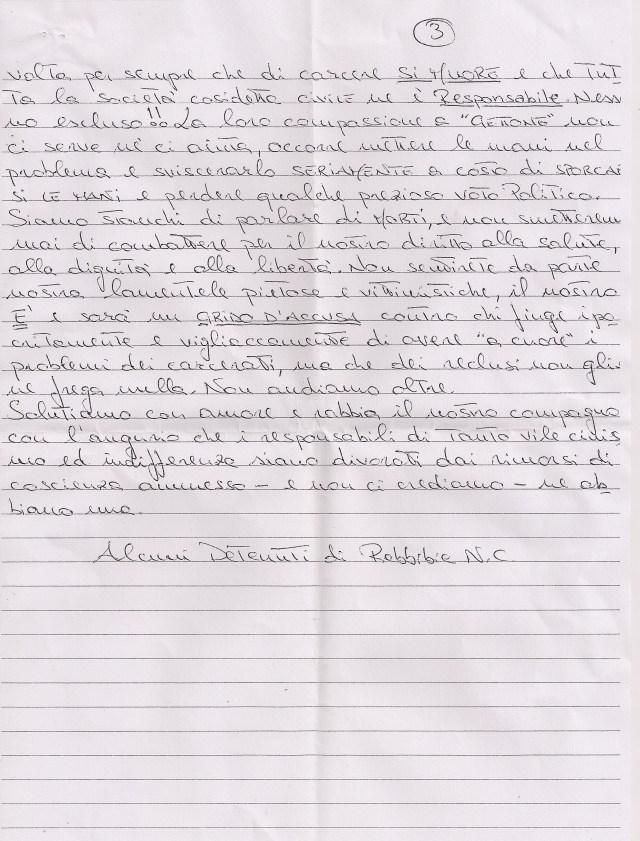 Questa lettera-denuncia ci è pervenuta stasera. E’ scritta dai detenuti di Rebibbia carcere di Roma, scritta con la penna e con tanta rabbia, non ancora espressa in lotta organizzata. Rabbia di fronte alla morte di un loro compagno dovuta al cinismo del sistema penitenziario e all’indifferenza della società. Diffondetela ovunque!!!