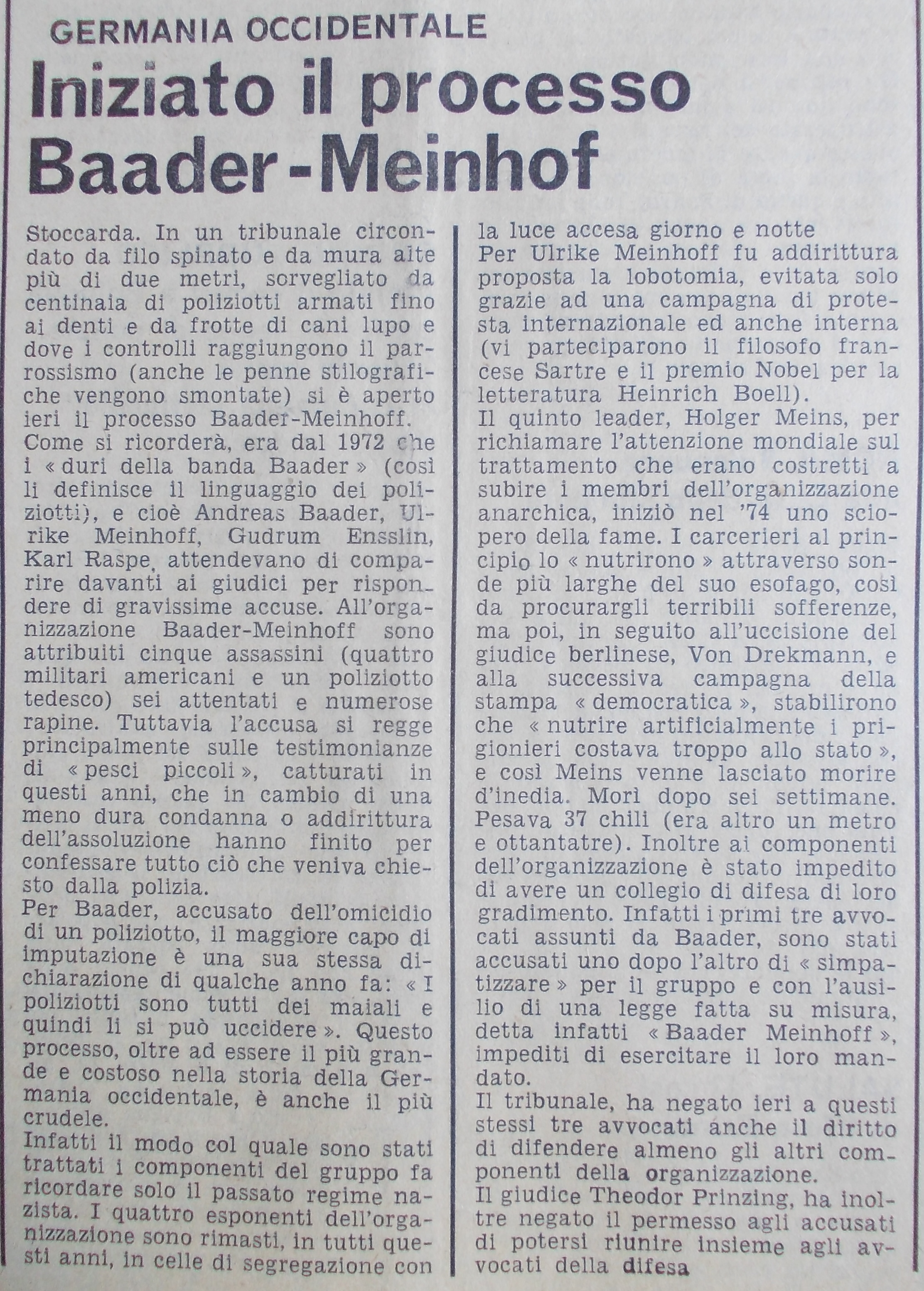 Gia si svolse tutto su binari polizieschi. Anche il giudice riconobbe che non tutto si era svolto in maniera regolare. Ma non era più importante. L’importante era che adesso mi avevano. Per il cazzotto al giudice federale mi hanno dato 7 mesi, che mi sono stati aggiunti ai 20 anni della condanna ed altri 6 anni mi sono stati aggiunti per un tentativo di fuga e questa condanna è servita a dimostrare la mia pericolosità. Lo sfondo di questa vicenda giudiziaria era che in mano non avevano quasi nulla contro di me. Fu così tentato di dimostrare la mia pericolosità con il processo Schleyer. In ogni caso restai isolato 3 anni prima che iniziasse il processo. I prigionieri progettavano allora uno sciopero della fame. Visto che la stampa venne al processo dovevo leggere quasi d’apertura la dichiarazione d’inizio di sciopero della fame. Là ho detto basta. Se siamo in sciopero della fame, il processo diventa una contrapposizione attorno allo sciopero della fame. Io avevo l’interesse però a condurre il processo in maniera offensiva. Volevo la contrapposizione sul 1977.[4]