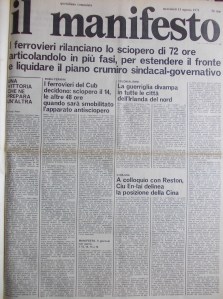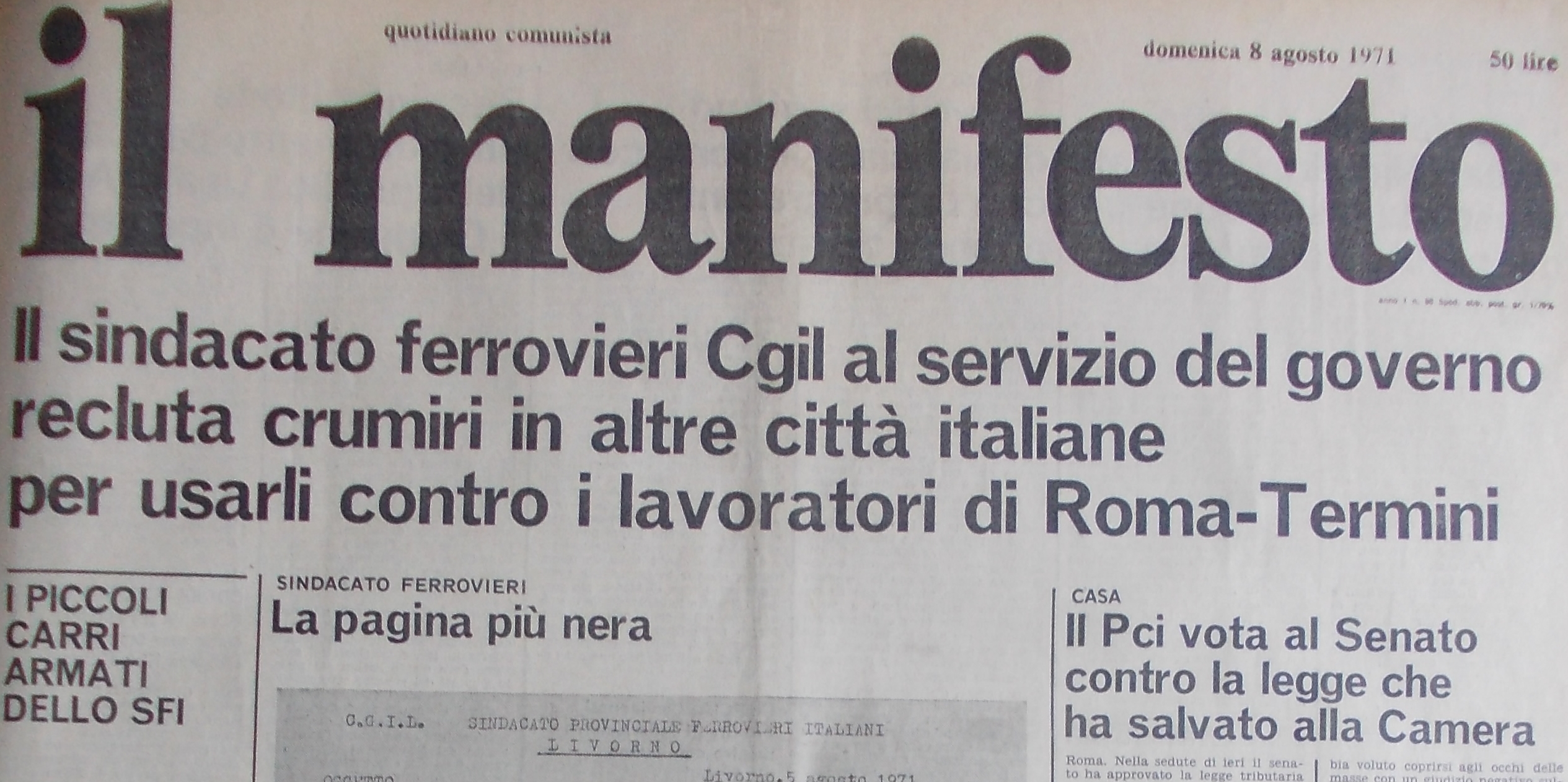 «il manifesto» dell’8 agosto ’71 uscì con un titolo a tutta pagina: Il sindacato ferrovieri Cgil al servizio del governo recluta crumiri in altre città italiane per usarli contro i lavoratori di Roma Termini. L’editoriale di Luigi Pintor era titolato: I piccoli carri armati dello Sfi. Sullo stesso giornale veniva riportata integralmente una lettera del Sfi-Cgil che organizzava il crumiraggio: