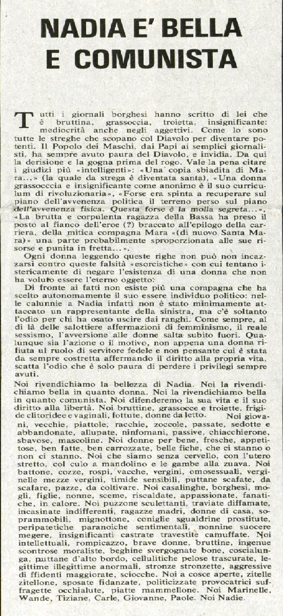 Il 19 gennaio ’76, il giorno dopo gli arresti del 18, i giornali si scatenarono nelle più bieche e indegne considerazioni che prendevano di mira Nadia, la donna. Come poteva aver scelto autonomamente la lotta armata? Era sicuramente “per amore”! O forse per rifarsi della sua “non avvenenza” fisica! E giù con lo squallido e desolante linguaggio fascista e maschilista della sottocultura borghese italiota.