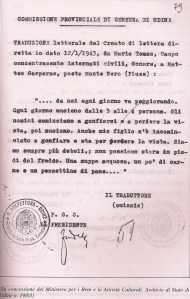 “Accampamenti di morte e di sterminio“, dove “La gente muore di fame. La minestra è acqua nella quale nuotano due chicchi di riso e due maccheroni“. Il peggiore di queste decine e decine di “campi” è stato quello di Gonars, poi quello di Arbe (Rab), Visco, Monigo, Chiesanuova, Renicci, Ellera, Colfiorito, Pietrafitta, Tavernelle, Cairo Montenotte, ecc…: “Avevo 6 anni e pesavo 13 chili. Con altri bambini cercavamo il cibo nei bidoni della spazzatura. Se trovavamo qualche grosso osso lo spaccavamo per succhiare il midollo. Mia madre era incinta. Mio fratello è nato il 3 febbraio 1943. E’ morto qualche mese dopo” Campi dove c’erano le punizioni, le torture, l’orrore di ogni campo di concentramento”.