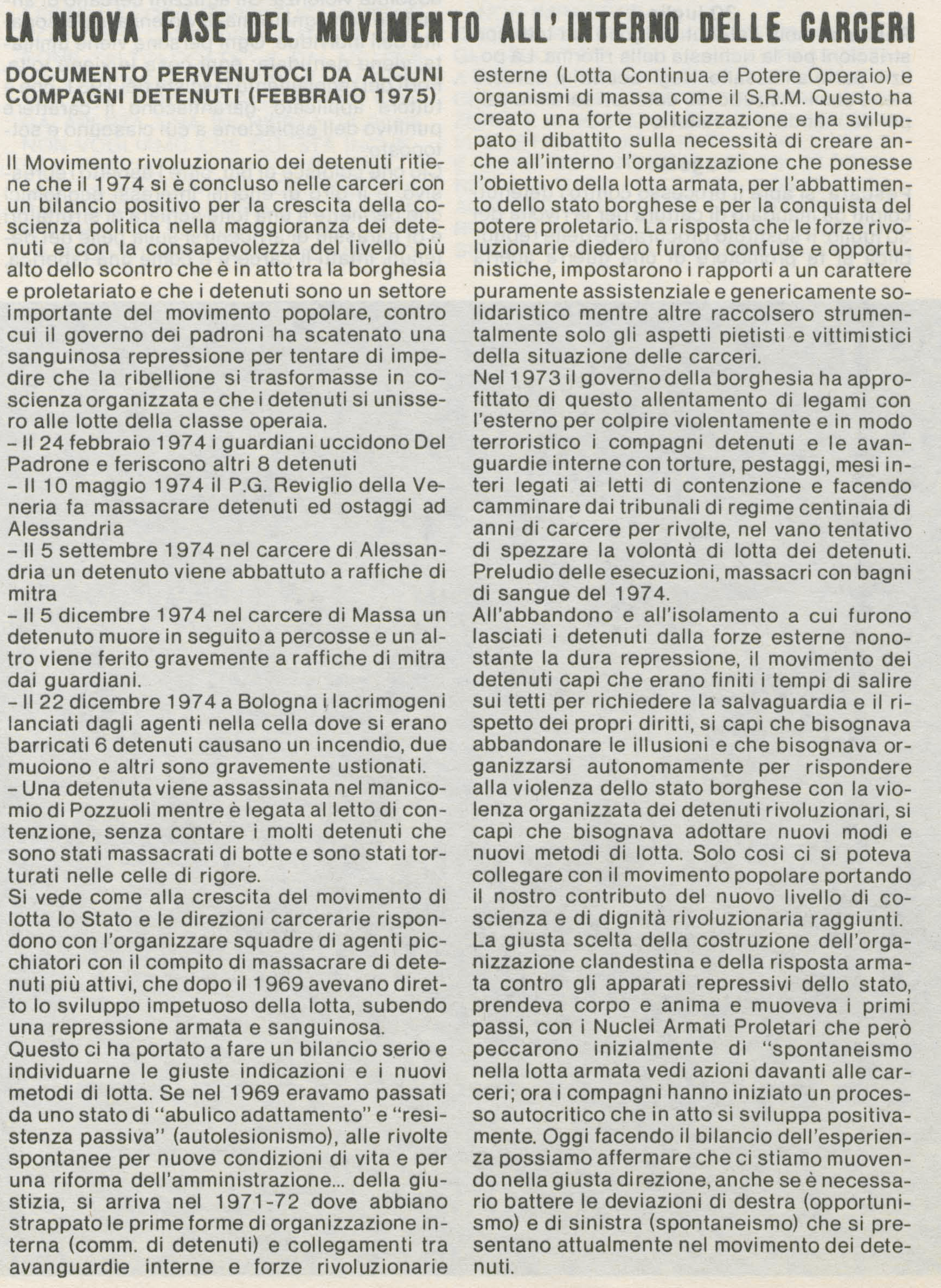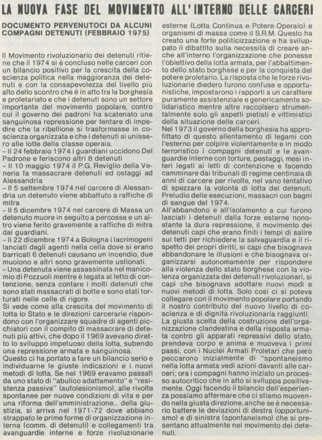 un documento di analisi politica del 1975 scritto dai detenuti