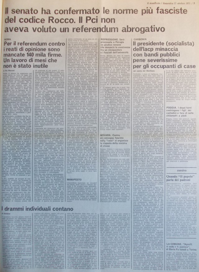 Qui una pagina di cronaca poco conosciuta (il Manifesto 17 ottobre 1971):