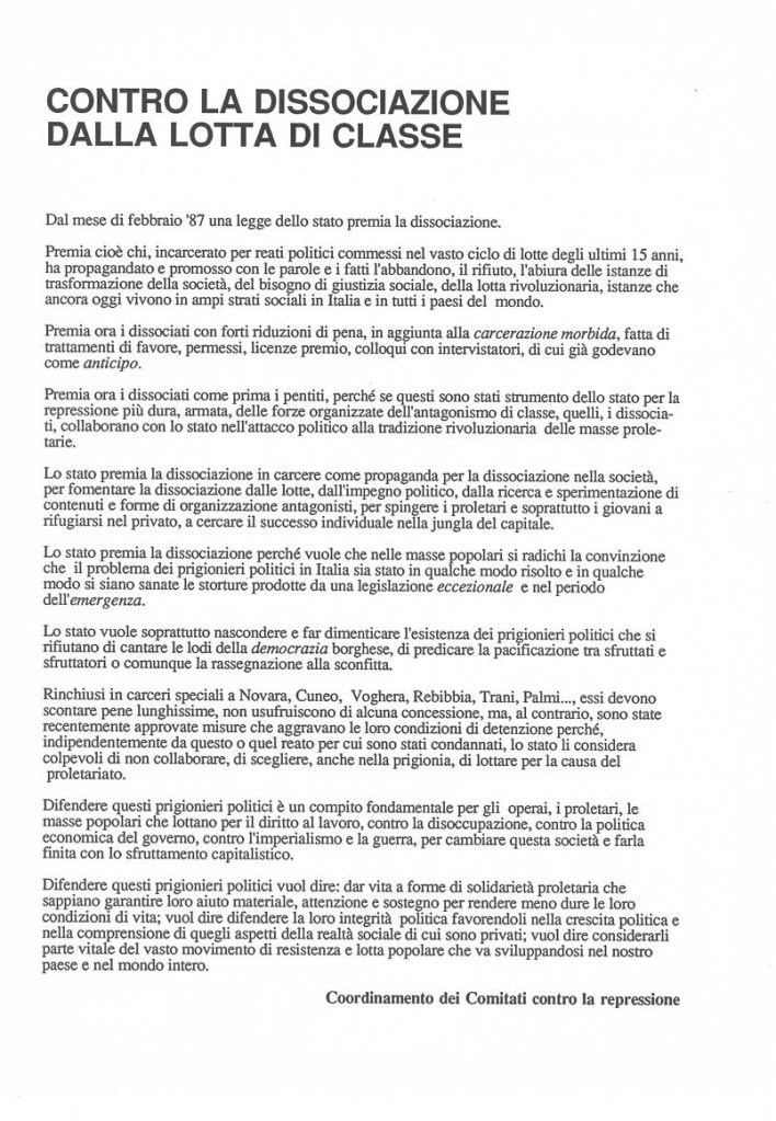 Poche parole per chiarire due concetti per me inportanti: esistono i pentiti ed i dissociati. I PENTITI secondo la legislazione dello Stato italiano sono degli INFAMI che rinnegando il loro passato militante facendo nomi, cognomi, luoghi e fatti per loro vantaggio personale, e per tale motivo andrebbero eliminati. Non accetto e non credo al pentimento! E’ un cocetto cattolico che io non riconosco.; se non hai la coerenza morale e politica di Salvatore, di Ferrari e tanti altri, ammazzati e non far ammazzare tanti altri bravi compagni. Gli infami sono sempre esistiti ( la prima cosa che leggi sui muri interni del carcere è…MORTE AGLI INFAMI), mentre la formulazione pentiti è stata coniata e premiata lautamente per i politici e per i mafiosi, e la rivoluzione come la mafia non si ferma nè con l’infamia, nè col pentitismo! Esistono poi i dissocati: DISSOCIATI di Stato che sono degli infami, e come tali premiati, che non fanno nomi ma che forniscono elementi utilissimi alle indagini ed a colmare vuoti od incertezze lasciate dalle indagini; tasselli utili per i loro “ronpicapo” e quindi utilissimi per individuare compagni /e; questi bastardi vanno puniti fisicamente perchè altri inparino ed arginare questa “diarrea logorroica”, anche se il processo rivoluzionario non è per colpa loro che rallenta.Infine ci sono i dissociati politici che non usufruiscono di “premi” ma che vogliono essere riammessi dalle varie “nomenclature” anarchiche o comuniste, si vergognano del loro opportunismo e sgattaiolano via appena ti intravedono.Vergognatevi!!!! e sparite dalla circolazione perchè ci fate vomitare! Spero di essere stato chiaro e comunque quanto ho detto fa parte della mia esperienza personale.