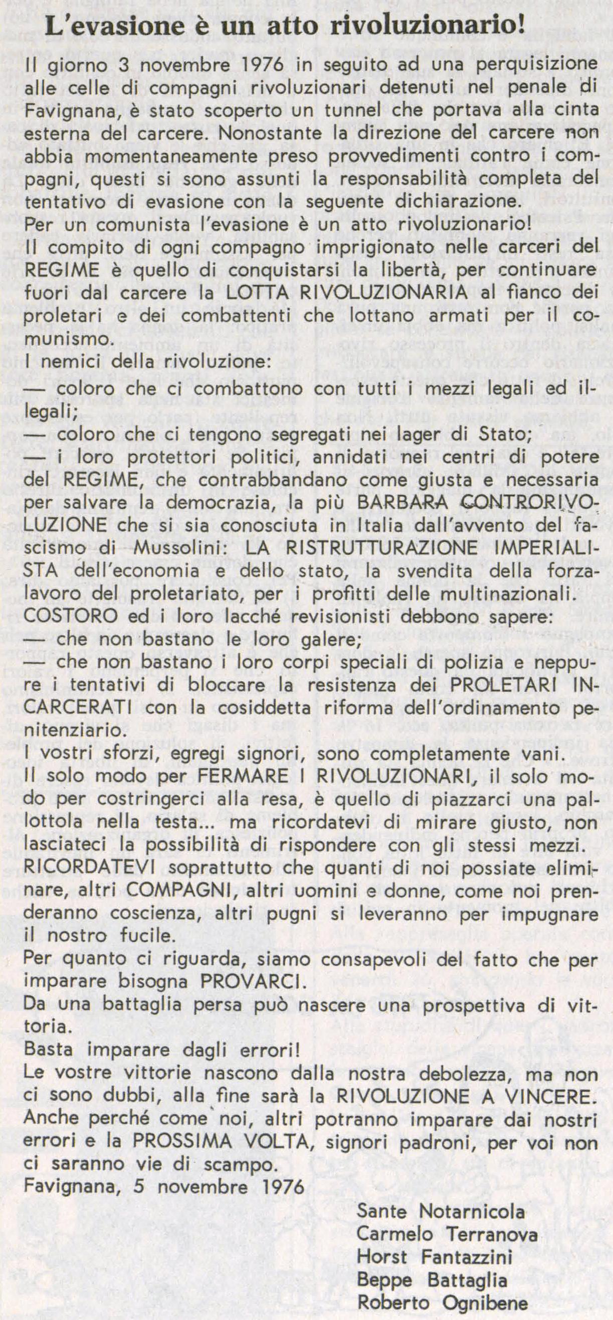 Non ho rimorsi, nè pentimenti e quando il “ferro era caldo” mi sono adoprato in mille modi; qualcuno, come Horst che purtroppo è deceduto, ed altri che oggi sono “fuori” potrebbero esserne testimoni. “NOI” non siamo cambiati, ma purtroppo è cambiato il contesto politico ed oggi possiamo consigliare, spronare, istigare in attesa di tempi migliori. E’ inportante però che qualcuno raccolga il nostro “testimone” e si prepari, perchè il cielo è più nuvoloso oggi di ieri.I fascisti non ci risparmiano le coltellate, quindi non sarebbe male avere un loro schedario, come si faceva un tempo, ed essere pronti a rispondere adeguatamente.Noi possiamo consigliare, poi è giusto che i giovani compagni si regolino in base alle loro esperianze pratiche ed alla loro maturità politica. Gianni Landi