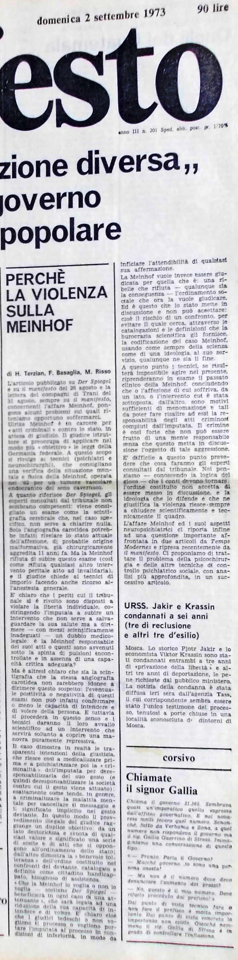 37 anni fa Ulrike Meinhof, militante della Raf (Rote Armee Fraktion), venne “suicidata” il 9 maggio del 1976. Oltre l’isolamento totale e le innumerevoli vessazioni, l’accanimento dello stato tedesco continuò anche dopo il suo assassinio. Ci provarono con l’aiuto della psichiatria. Qua sotto un triste articolo del Corriere della Sera del 2002 (che rimpiange Lombroso) e uno de il Manifesto del 1973