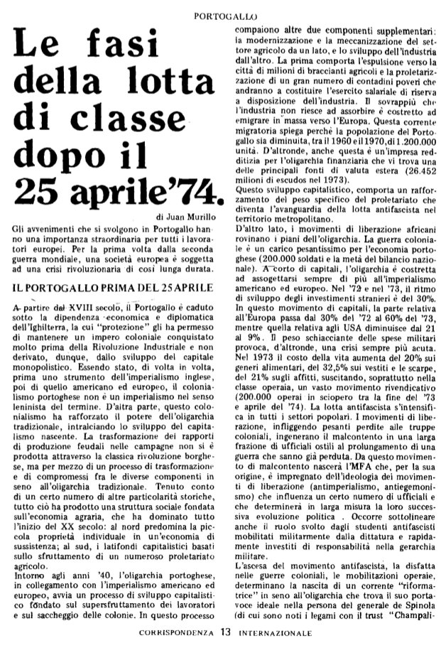 I1 25 aprile è il prodotto della convergenza di tutte queste contraddizioni, su un obbiettivo preciso e limitato: il rovesciamento della dittatura di Caetano. Sarebbe dogmatico vedere negli avvenimenti del 25 aprile soltanto una manovra della borghesia. L’MFA è La forza politica che dà l’ultimo colpo al fascismo, ma questo era già stato fortemente scosso dai movimenti di liberazione africani e dal movimento antifascista in Portogallo.