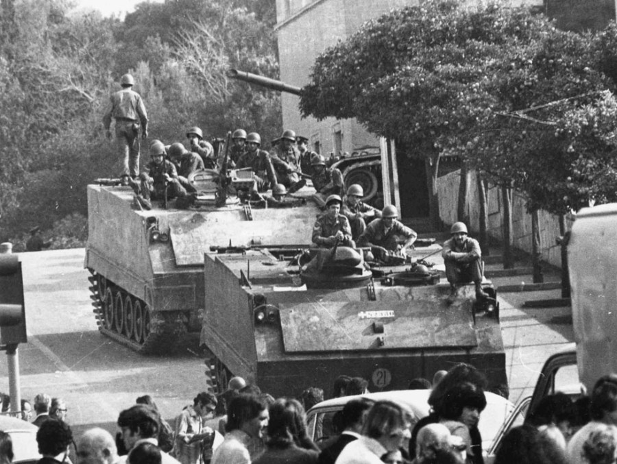 Carri armati dell’esercito in piazza della Costituzione, di fronte al parlamento greco, in vista del coprifuoco delle quattro del pomeriggio imposto in seguito alle proteste
