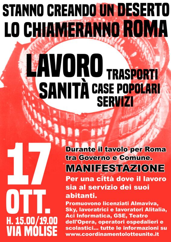 Per queste ragioni il coordinamento lotte unite invita tutte le lavoratrici e i lavoratori di Roma a un percorso di mobilitazione che imponga questi temi al centro di qualsiasi tavolo di lavoro per arrestare il deserto che sta sommergendo Roma. Non abbiamo fiducia nel tavolo MISE/Comune di Roma/rappresentanti istituzionali delle categorie sociali ma proprio per questo vogliamo far sentire la nostra voce e le nostre lotte per affermare, finalmente, le ragioni di chi lavora.