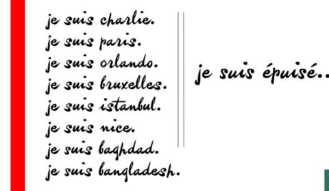 varianti per altrettanti successivi attentati con vittime, tanto da determinare una macabra concorrenza e comunque una saturazione. Prima, in reazione agli attentati dell’11 settembre 2001, c’era stato il ‘Nous sommes tous Américains’, dal titolo dell’editoriale, firmato dal direttore di Le Monde, Colombani, che probabilmente nessuno ha davvero letto o ricorda: la sua interpretazione come ‘siamo tutti vittime’ bastò a farne uno slogan politico importante.