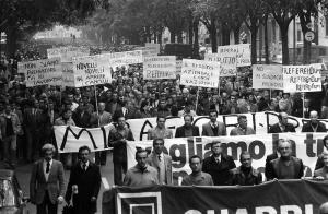 1980…La crisi in corso, come le altre, veniva utilizzata dal capitale per far arretrare lo scontro. Il padronato, utilizzando i media, ne accentuava gli effetti agitando lo spauracchio della perdita del posto di lavoro. La tensione sociale era alta, ma la lotta di classe non la faceva solo la classe operaia, l’offensiva la stava prendendo in mano il padronato: massicci licenziamenti, 40.000 colletti bianchi in piazza (in realtà quei famosi 40.000 erano solo qualche migliaio; la questura quel giorno parlò di 10-12.000 ma dopo qualche tempo sui giornali erano diventati 40.000). Stampa e tv avevano esaltato quella «marcia dei 40.000» come una svolta storica, sostenendo che essa segnava la fine della lotta di classe e della centralità operaia. Funzionari, quadri intermedi, dirigenti e alti impiegati, con l’appoggio dei bottegai e della buona borghesia torinese, manifestarono per Torino chiedendo «ordine per lavorare». In sé quell’evento non era nulla di veramente straordinario, acquistava forza grazie al contorno mediatico e perché collocato all’interno di una campagna repressiva fatta di arresti, licenziamenti, cassa integrazione, reparti confino, flessibilità ecc. Anche se occorre riconoscere che non era abituale vedere una manifestazione con lo slogan «vogliamo ordine per lavorare». L’invito al governo era esplicito: mettete in piazza pure l’esercito, purché fermiate questo conflitto e il crescente contropotere operaio per ripristinare in fabbrica l’ordine e la gerarchia. I benpensanti affermavano di essere la maggioranza degli italiani. Ma i quadri intermedi della Fiat si dimostrarono non molto intelligenti e lungimiranti, dato che in seguito vennero licenziati anche loro. L’esito di 37 giorni di lotta fu di 61 licenziati e 24.000 cassaintegrati.